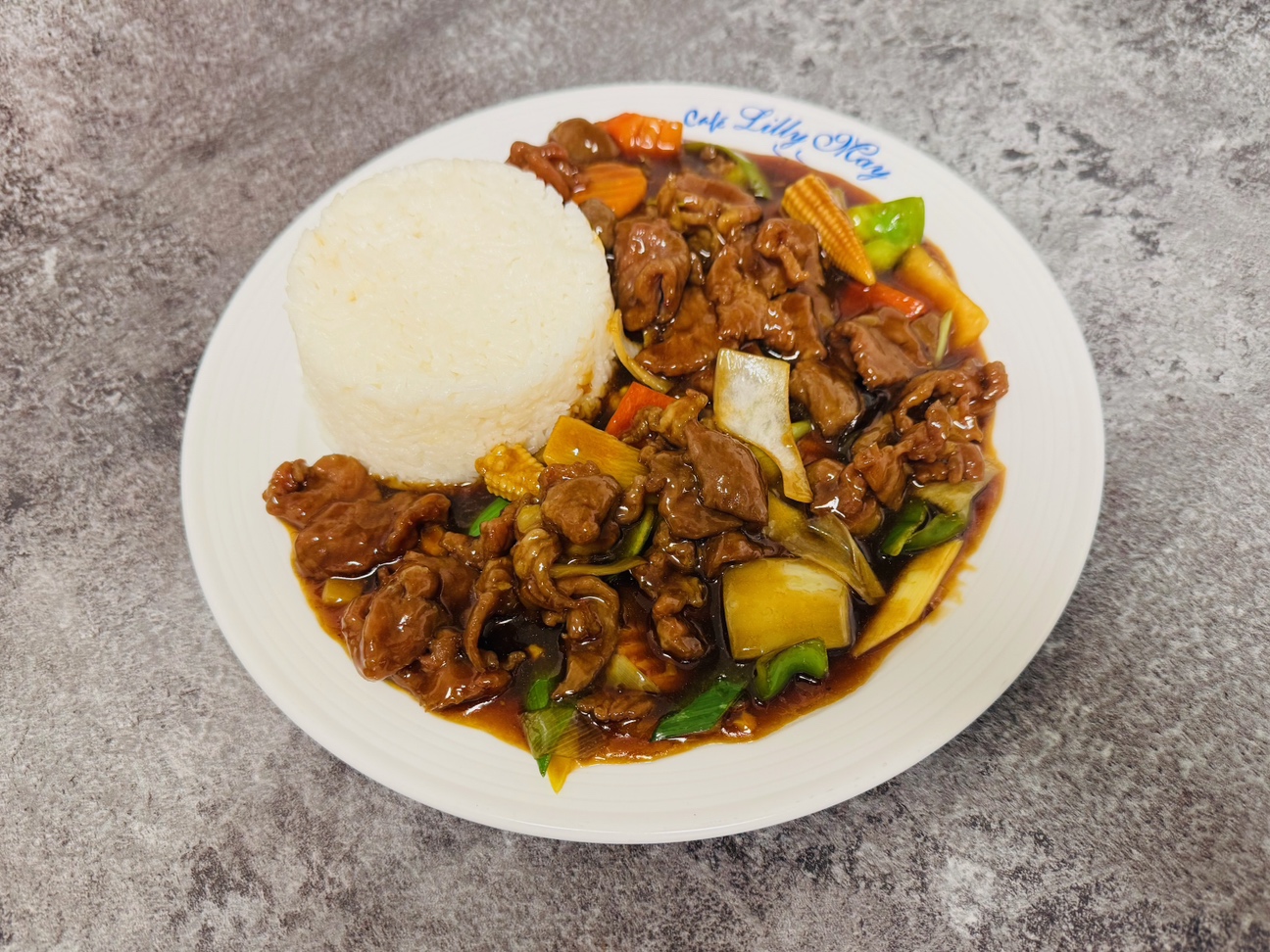 Stekt biff med løk , paprika og sjampinjong sopp , toppet med sesamfrø. Serveres med jasmin ris